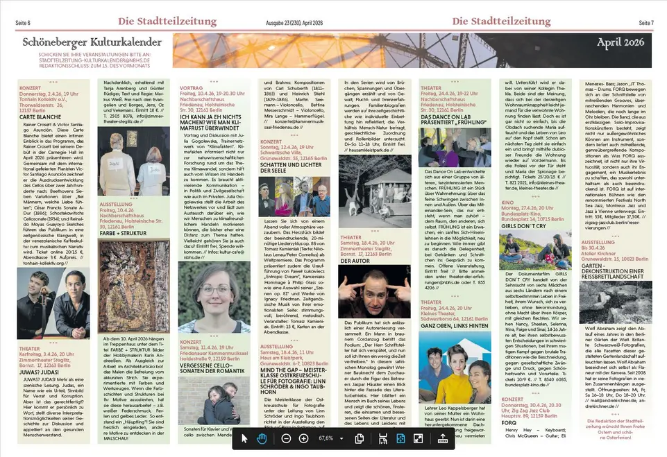 Unsere aktuelle Ausgabe für den Monat April finden Sie hier zum Download. Wie immer dabei der neue Schöneberger Kulturkalender mit interessanten Veranstaltungstipps rund um Musik, Theater, Film, Ausstellungen und vieles mehr.
