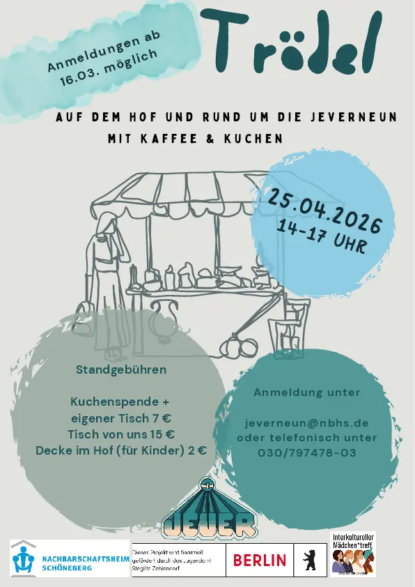 Dort findet ihr gut erhaltenes Kinderspielzeug, Kleidung, Hausrat und vieles mehr. Wer Lust auf Kaffee und Kuchen hat, wird ebenfalls fündig. Los geht es am Samstag, den 25.4. 2026, von 14.00 bis 17.00 Uhr in der Jeverstraße 9, 12159 Berlin. Wir freuen uns auf euch!